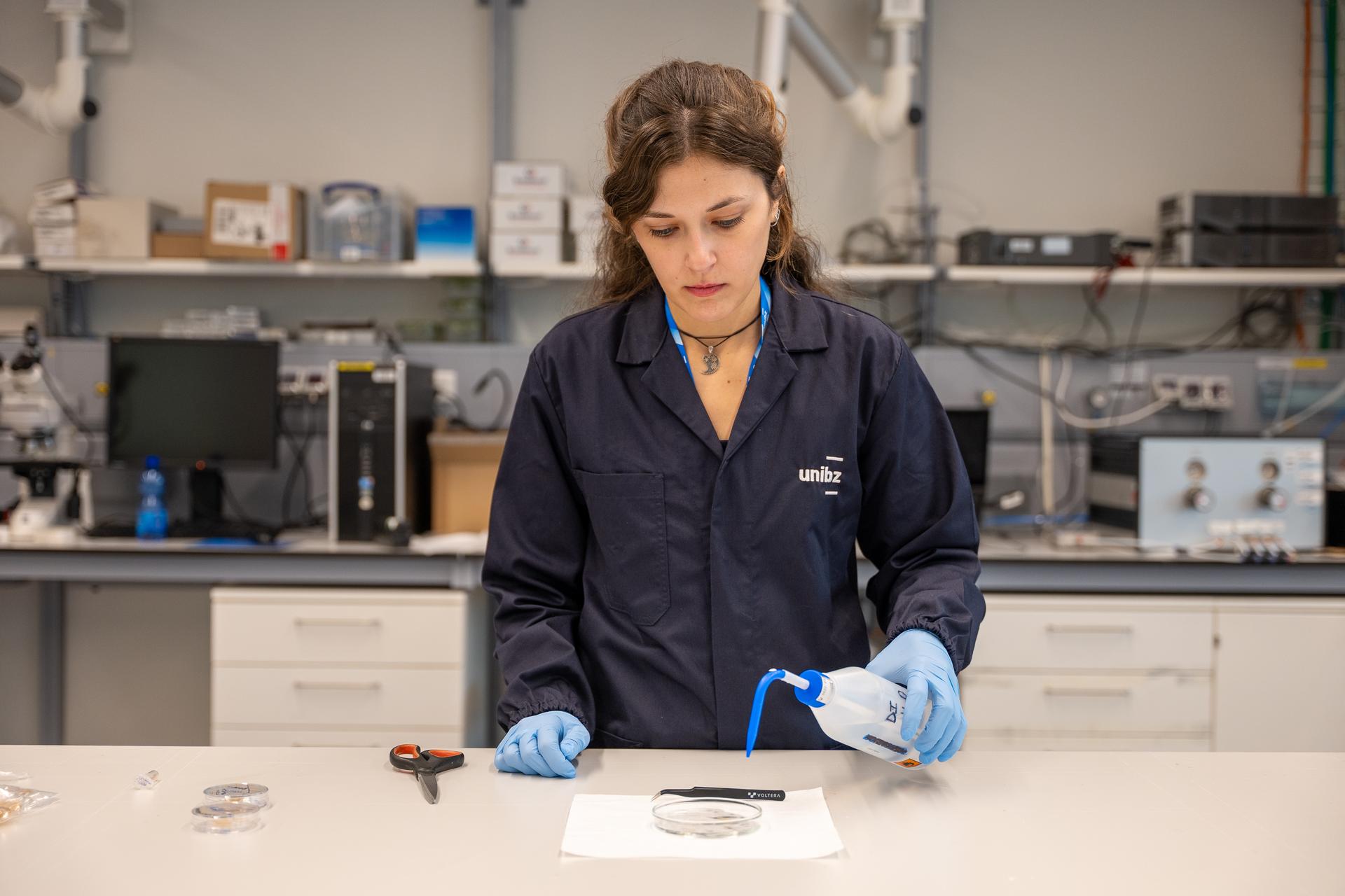 La ricerca è pubblicata sulla rivista ACS Agricultural Science & Technology: l’impalcatura superassorbente in biopolimeri trattiene l’acqua e fa crescere le piante anche in condizioni di siccità. Nell’immagine la ricercatrice Camilla Febo al lavoro nel laboratorio di Unibz (foto Matteo Vegetti).