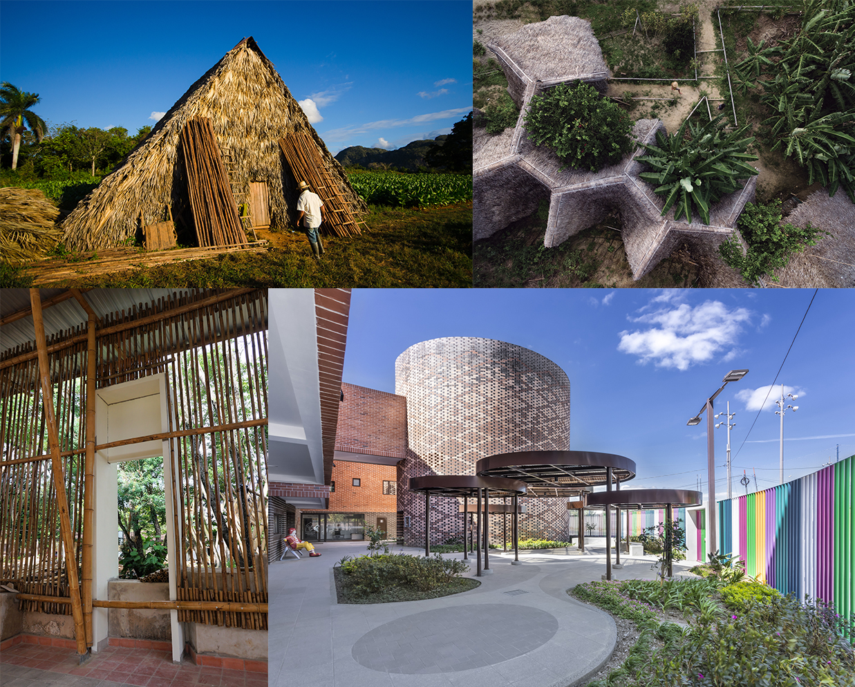 Tra i progetti illustrati troviamo la “Casa Parásito” a Quito, un prototipo urbano di  micro-abitazione o tiny house, che posta sulla copertura di fabbricati, rappresenta la risposta sostenibile ed inclusiva per risolvere le esigenze abitative delle giovani generazioni in coppia o single, la “Casa Fortunata” costruita attorno a un albero millenario e monumentale nel sud del Brasile, la “Vivienda Ara Pytu” in Paraguay, che si integra nel bosco secondo la visione cosmologica guaraní e che impiega il tetto- giardino per ridurre la temperatura interna e migliorare l’efficienza energetica, e la “Casa de la lluvia (de ideas)” a Bogotá, uno spazio sociale autogestito  realizzato con tecniche di autocostruzione e materiali locali. E, ancora,il “Jardín Hospedero y Nectarífero” a Cali, il “CIVAC Parque Lineal” in Messico, il recupero di un vecchio caseggiato “Conventillo de La Boca” a Buenos Aires o la “Casa Pachacamac” scavata nella roccia vicino Lima, che disegnano una geografia architettonica che si nutre della diversità e della memoria dei luoghi. La “Iglesia sin religión” dell’architetto colombiano Simón Vélez, costruita in bambù guadua, rappresenta poi uno degli esempi più emblematici di questa visione organica e comunitaria dell’architettura.